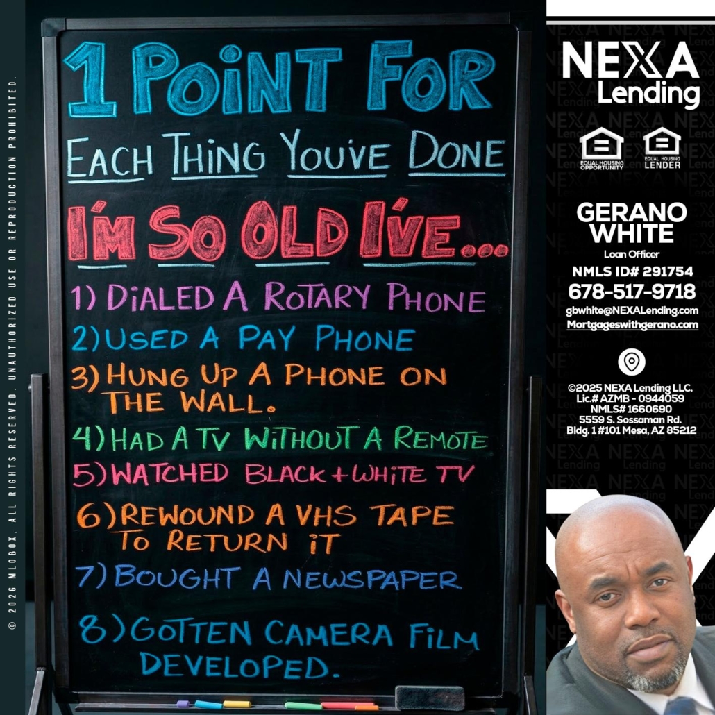 1 point for - Gerano White -Loan OfficerHi, my name is Gerano White. I’m a Loan Officer with NEXA Lending LLC., offering personalized mortgage solutions, fast customized quotes, great rates and service with integrity.