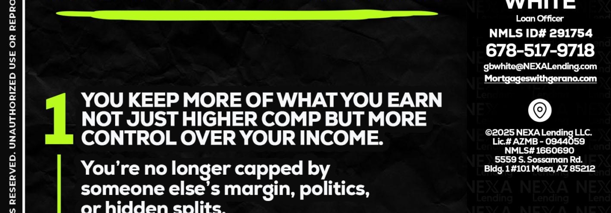 7 THINGS (1) - Gerano White -Loan OfficerHi, my name is Gerano White. I’m a Loan Officer with NEXA Lending LLC., offering personalized mortgage solutions, fast customized quotes, great rates and service with integrity.