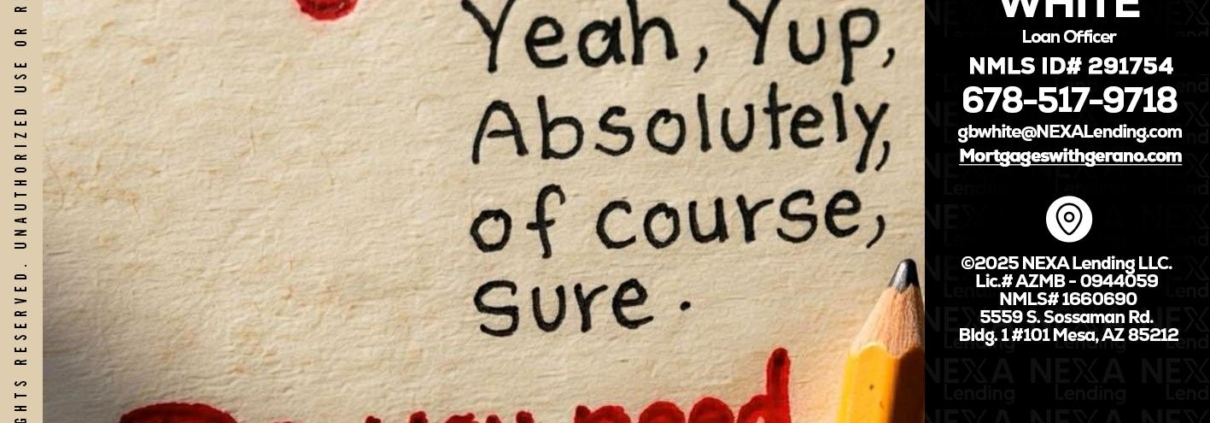 answer without - Gerano White -Loan OfficerHi, my name is Gerano White. I’m a Loan Officer with NEXA Lending LLC., offering personalized mortgage solutions, fast customized quotes, great rates and service with integrity.