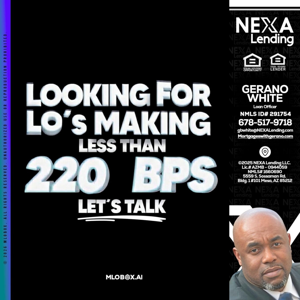Hi, my name is Gerano White. I’m a Loan Officer with NEXA Lending LLC., offering personalized mortgage solutions, fast customized quotes, great rates and service with integrity.