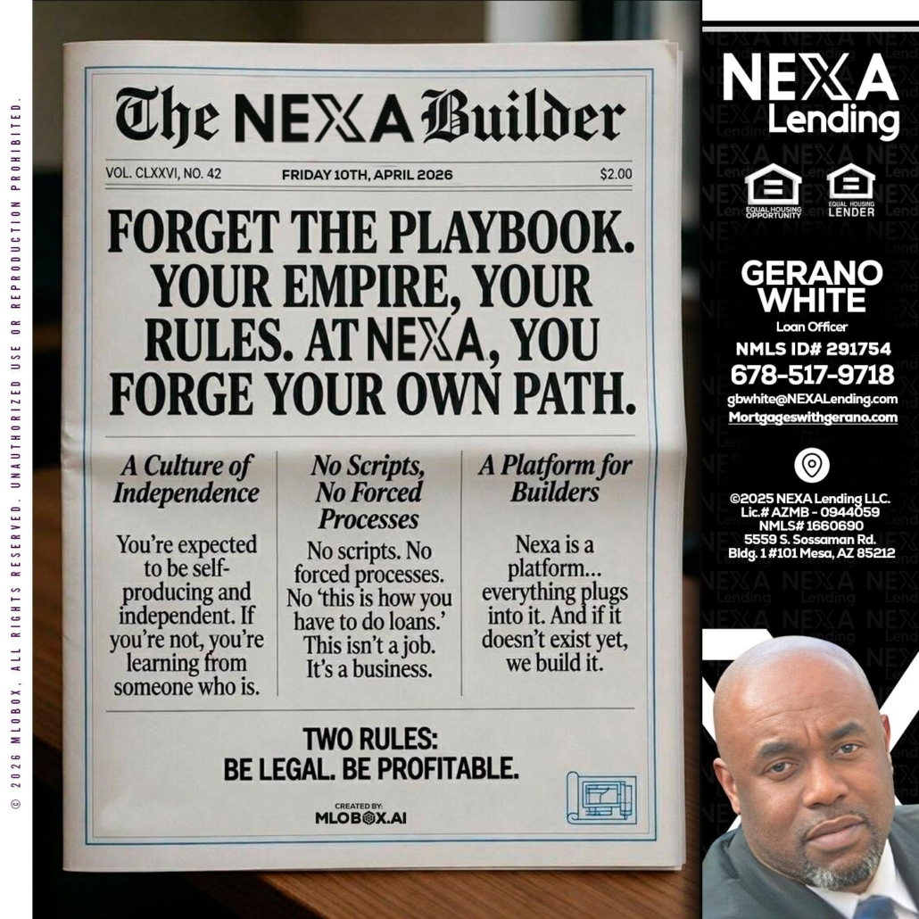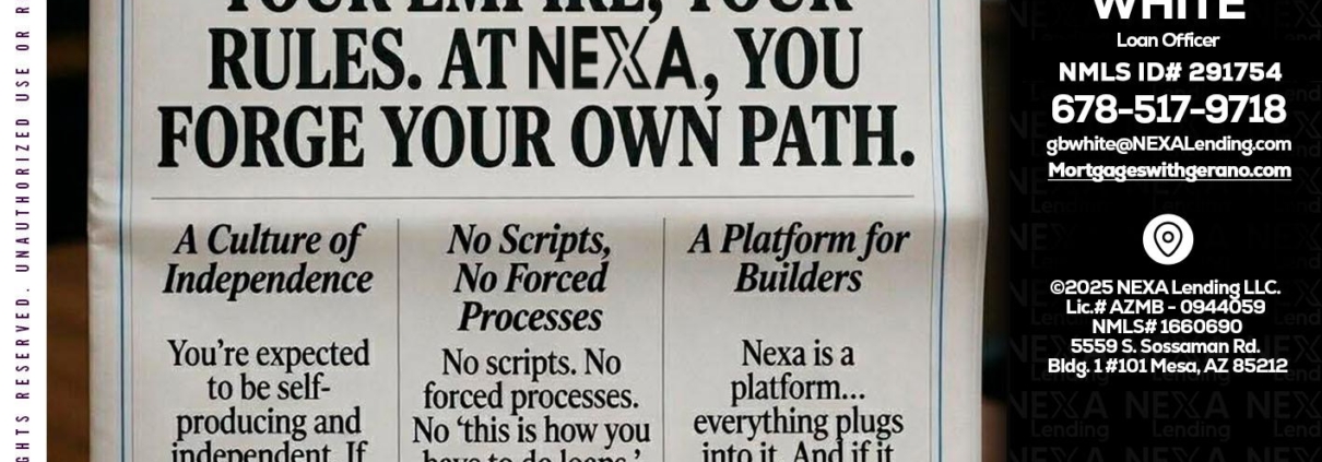 Hi, my name is Gerano White. I’m a Loan Officer with NEXA Lending LLC., offering personalized mortgage solutions, fast customized quotes, great rates and service with integrity.